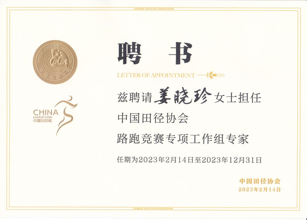 我院姜晓珍教授再次受聘为中国田径协会路跑竞赛专项工作组专家