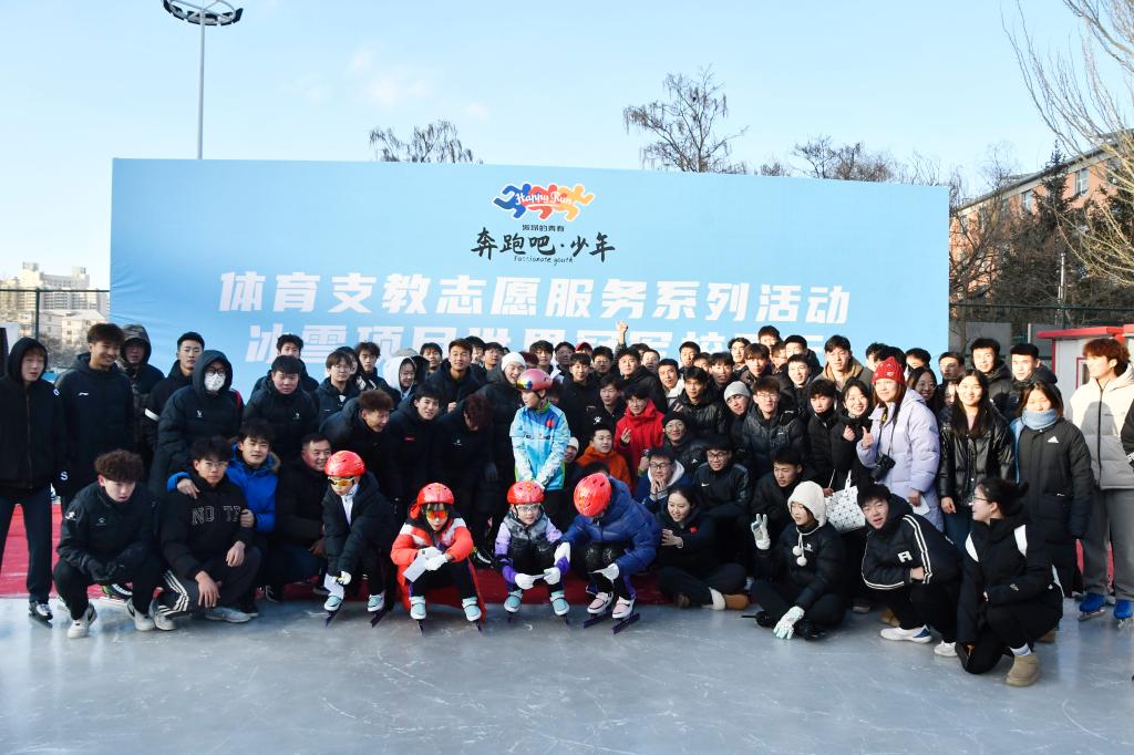 速度滑冰青奥世界冠军李岩哲现场教学,随后换上冰鞋同现场的师生一起练习。最后,两位世界冠军为大家进行签名,并合影留念。