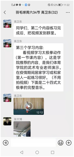 开课一周以来,各项教学工作平稳进行,学生顺利加入班级微信群,教师在群内发布上课平台链接,布置课前准备和课后作业,及时答疑,与学生形成良好互动。学生学习“不断线”,教师教学“守时间”,教学质量“有保障”,实现在线学习与线下课堂教学,有力的保证了我校大学生体育锻炼习惯的培养和体育健康的促进。
